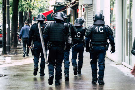 Paris France May 11, 2019 Portrait of a riot squad of the French National Police in intervention during protests of the Yellow Jackets against the policy of President Macron in Paris on saturday afternoon