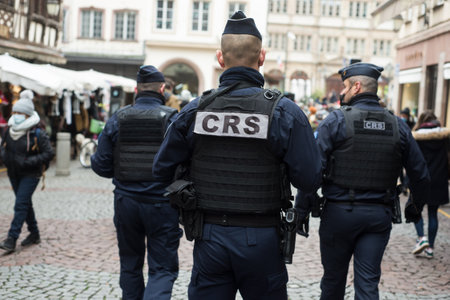 Strasbourg - 29 November 2021 - Portrait on back view of french police men patrolling in the street at the christmas market