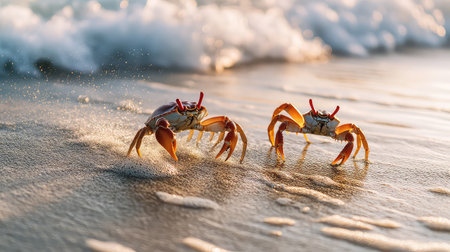Two crabs navigate the wet sand along a serene beach, while gentle waves kiss the shoreline under a beautiful sunset, depicting nature's perfection.