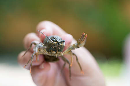 A brown north sea crab crustacean in the palm of a woman hand. edible shellfish marine life. Seaside food chain and cuisine. Fantastic crab claw fresh crab meat.