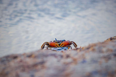 Small crabs crawling on the rocks on the shore. Coral reef wildlife