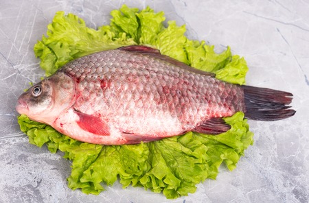 Fresh alive crucian on the green lettuce leaves over table-top background