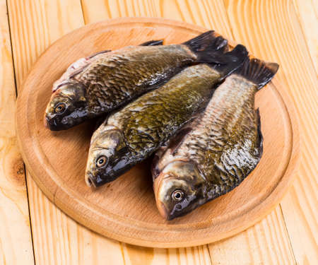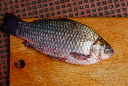 a large live crucian lays on a brown board