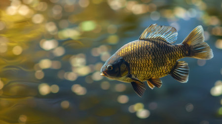 A vibrant freshwater fish swims gracefully through sunlit water, surrounded by aquatic plants. The serene underwater environment showcases nature's beauty and biodiversity.