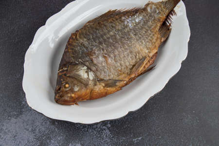 fresh fish crucian on white plate. fancy dinner