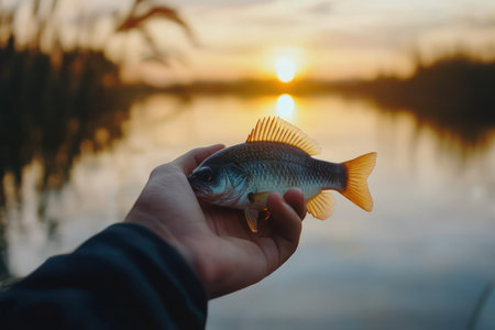 Fisherman proudly holds caught perch or bass with glowing sunset in background, symbolizing outdoor recreation and sport fishing.
