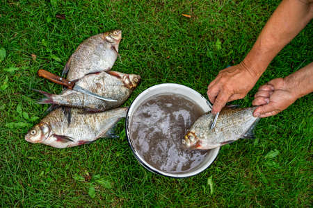 Women's hands cleaning fresh fish from scales in plate of water on background of green grass