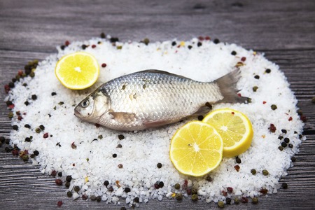 A fresh carp live fish lying on a on salt and pepper background with slices of lemon and with salt dill. Live fish crucian Carassius auratus gibelio