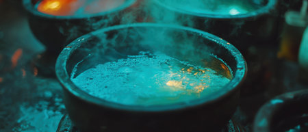 Bubbling cauldron of colorful magic potion with mystical steam and alchemical essence