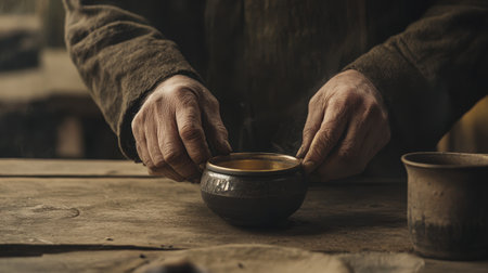 A skilled artisan demonstrates the craft of pottery, shaping a unique handmade bowl with expert hands in a rustic workshop filled with natural light.