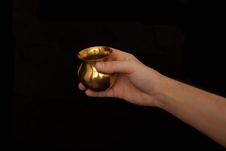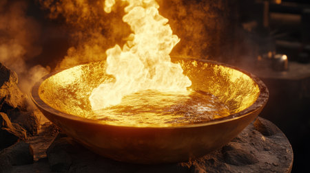 A captivating moment captures the essence of liquid gold pouring from a hand into a round shiny surface. The warm light and textures create an artistic representation of nature.