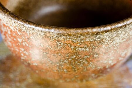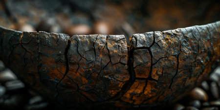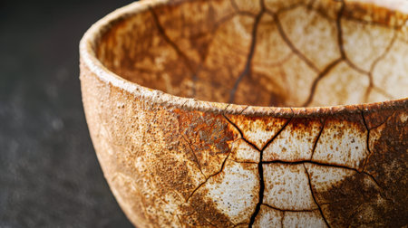 Close up view of rustic ceramic bowl featuring textured surface with cracks and earthy tones, showcasing its unique craftsmanship and natural beauty. bowl design evokes sense of warmth