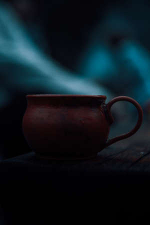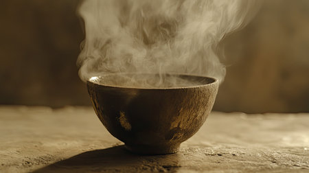 A beautiful rustic bowl emits a gentle steam, creating a warm and inviting atmosphere. Perfect for conveying coziness and comfort in culinary settings.
