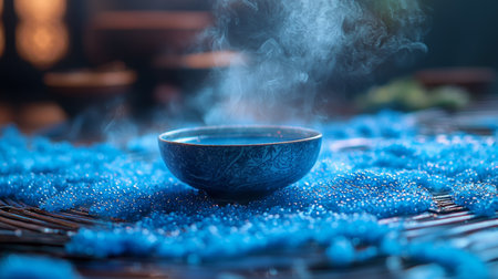 A serene zen-inspired setup featuring a bowl surrounded by a smoky atmosphere on a blue surface.