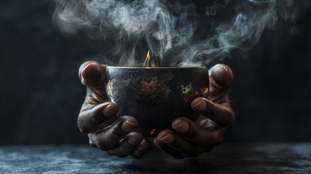 A moody composition of hands holding a steaming cup of tea, emphasizing warmth and tranquility.