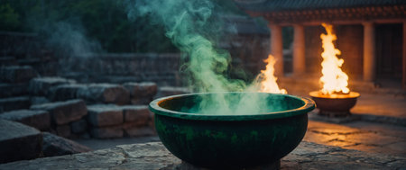 AI Generated. Mystical Cauldron Emitting Green Smoke in Ancient Temple at Dusk