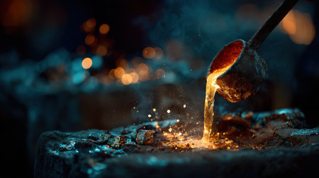 Molten metal cascades from a bucket into a unique, stomach-shaped cavity in stone, illuminated by striking orange and blue hues during the smelting process.