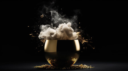 3D gold egg levitating abstract, exploding with smoke cloud on black background. Generative ai