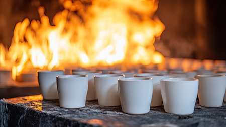 A collection of ceramic cups lined up in a workshop, illuminated by a warm, glowing fire, creating a cozy and inviting atmosphere perfect for any setting.