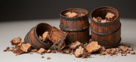 Rusty broken oil drums on white background - industrial decay and environmental impact.
