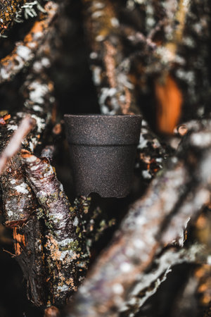 A striking minimalist black cup sits elegantly on a rough stone surface, embodying simplicity and sophistication in design. The soft background enhances the tranquil atmosphere.