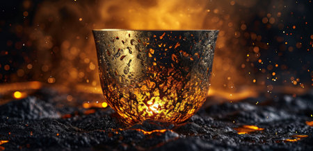 The Art of Transformation Craftsman s Hands Cradling Metal Bowl Emitting Glowing Light and Sparks.