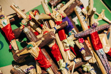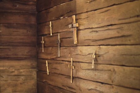 Wooden cross symbol of christianity texture. Holy wall catholic religion. Hanging rosary background. Pilgrimage destination in Poland. Święta Woda near Białystok city in Podlasie region.