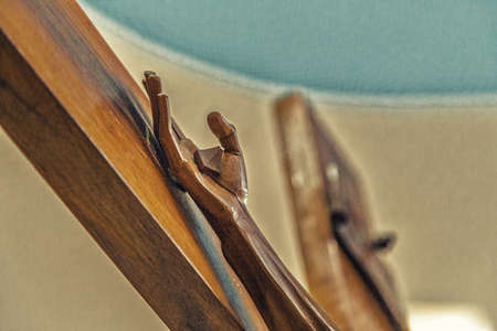 Sculpture of Jesus Christ on the cross. Wooden crucifix of the Savior. Concept of Easter, divinity, faith, crucifixion, resurrection, religious, Christian beliefs. Isolated on White background.