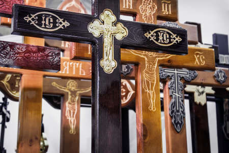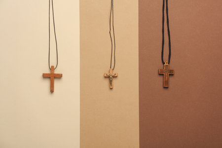 Crucifixes on light background. They represent the cross of Christ, a symbol of veneration of the sacrifice of Jesus Christ in the Christian tradition. The crucifix is also called the Episcopal Cross.