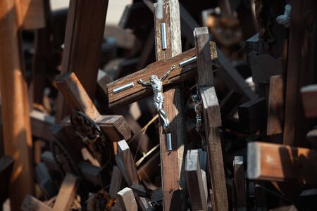Crucifixion of Christ and a large number of crosses at Hill of Crosses. Hill of Crosses is a unique monument of history and religious folk art in Siauliai, Lithuania.