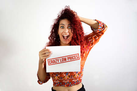 Amazed and happy girl with her mouth open with one hand on her head and holding a crazy low price sign with the other hand. Young woman with white skin and curly red hair dressed in colorful patterned clothing