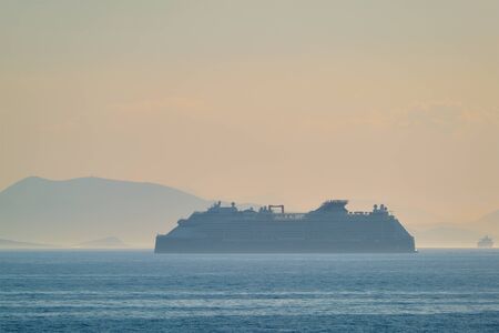 Luxury cruise ship in the ocean sea at sunset. Cruise vacation getaway. Aerial view of cruise ship. Premium liner in Mediterranean. Luxury liner. Luxury tourism travel on summer holiday