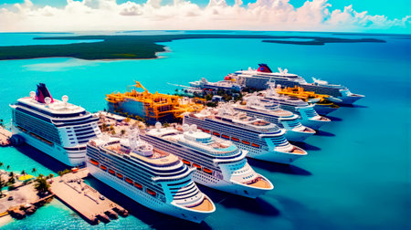 Group of cruise dock ships in harbor next to each other on sunny day. Generative AI.