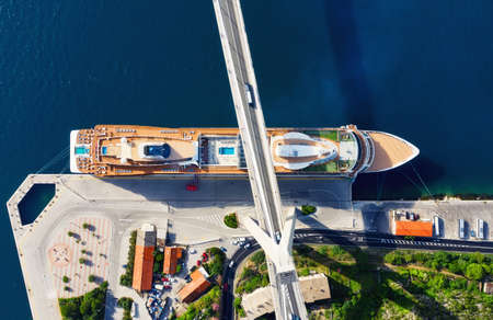Aerial view at the cruise ship and bridge in the port. Adventure and travel. Landscape with cruise liner on Adriatic sea. Luxury cruise. Dubrovnik, Croatia. Travel - image