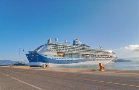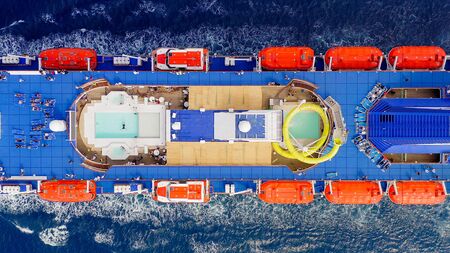 Top view of a large cruise liner ship with swimming pool moored in marina of Adriatic sea.