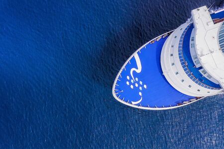 Cruise liner luxury ship in crystal blue Mediterranean sea water. Top aerial view.