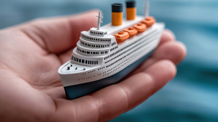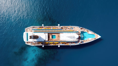 Top-down shot of a cruise ship with a vibrant blue ocean, highlighting every deck detail as it sails alone in the open sea