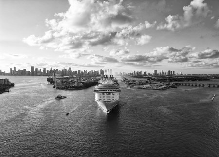 Miami tour. Cruise ship voyage. Aerial view of cruise in summer vacation. Cruise ship tour and travel at sea. Aerial view of luxury liner voyage. Ship leaving Miami beach port. Scenic deck views
