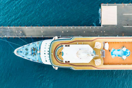 Cruise liner luxury ship in berth in port, blue sea water. Top aerial view.