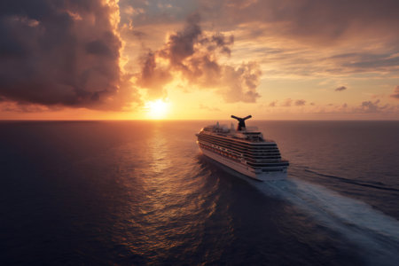 A majestic cruise ship embarks on a journey across the calm sea, basking in the warm glow of sunset. The horizon stretches out, inviting a sense of adventure and tranquility