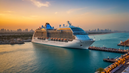 A cruise ship is docked at a dock at sunset. Created by Generative AI Tools
