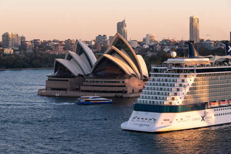 Sydney, Australia - March 20, 2020: A big cruise ship passing through Sydney Opera House.