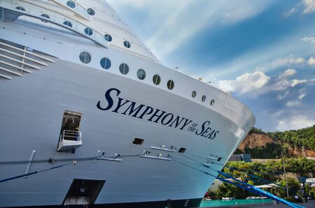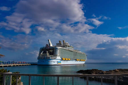 Coco Cay, Bahamas - April 29, 2022: Symphony of the seas is the biggest cruise ship, docked in Cococay, the private island post that's owned by the Royal Caribbean cruise line