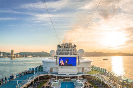 Takamatsu, Japan - 25 Sep 2019 : Tourist are relaxing on the top deck of Diamond Princess cruise ship with large LED TV and swimming pool.