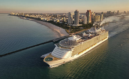 Aerial view of luxury liner voyage. Ship leaving Miami beach port. Miami tour. Cruise ship voyage. Aerial view of cruise in summer vacation. Cruise ship tour and travel at sea. Tour voyage