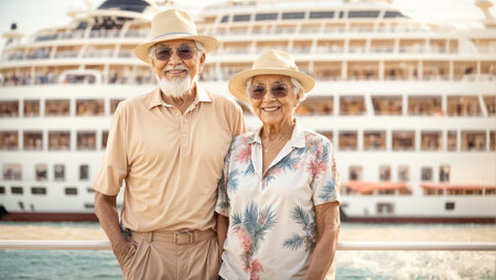 Senior couple traveling together on a cruise ship. Elderly people on vacation.