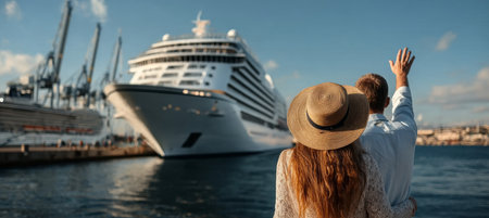 Excited couple waves enthusiastically at the grand cruise ship as it prepares for scenic departure