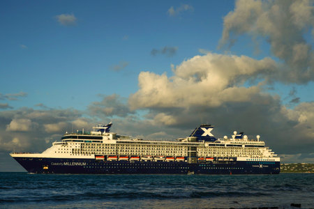 ST. JOHN - ANTIGUA: JANUARY 1, 2022: Celebrity Millennium Ship leaving the port of St. John's in Antigua and Barbuda. Delivered in 2000, she is the oldest operating ship in Celebrity's fleet
