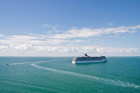 Cruise ship voyage. Majestic view of cruise in summer vacation. Cruise ship tour and travel at sea. Trip on luxury liner voyage. Ship leaving Miami beach port. Miami tour
