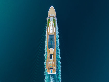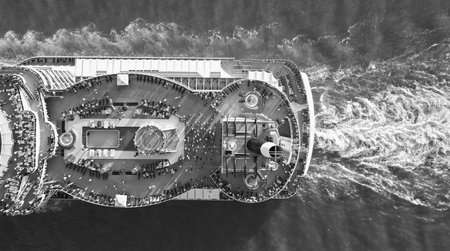 Luxury liner resort. Cruise ship voyage. Aerial top view of cruise in summer vacation. Cruise ship tour and travel at sea. Aerial view of luxury liner voyage. Ship top view. Elegant cruise